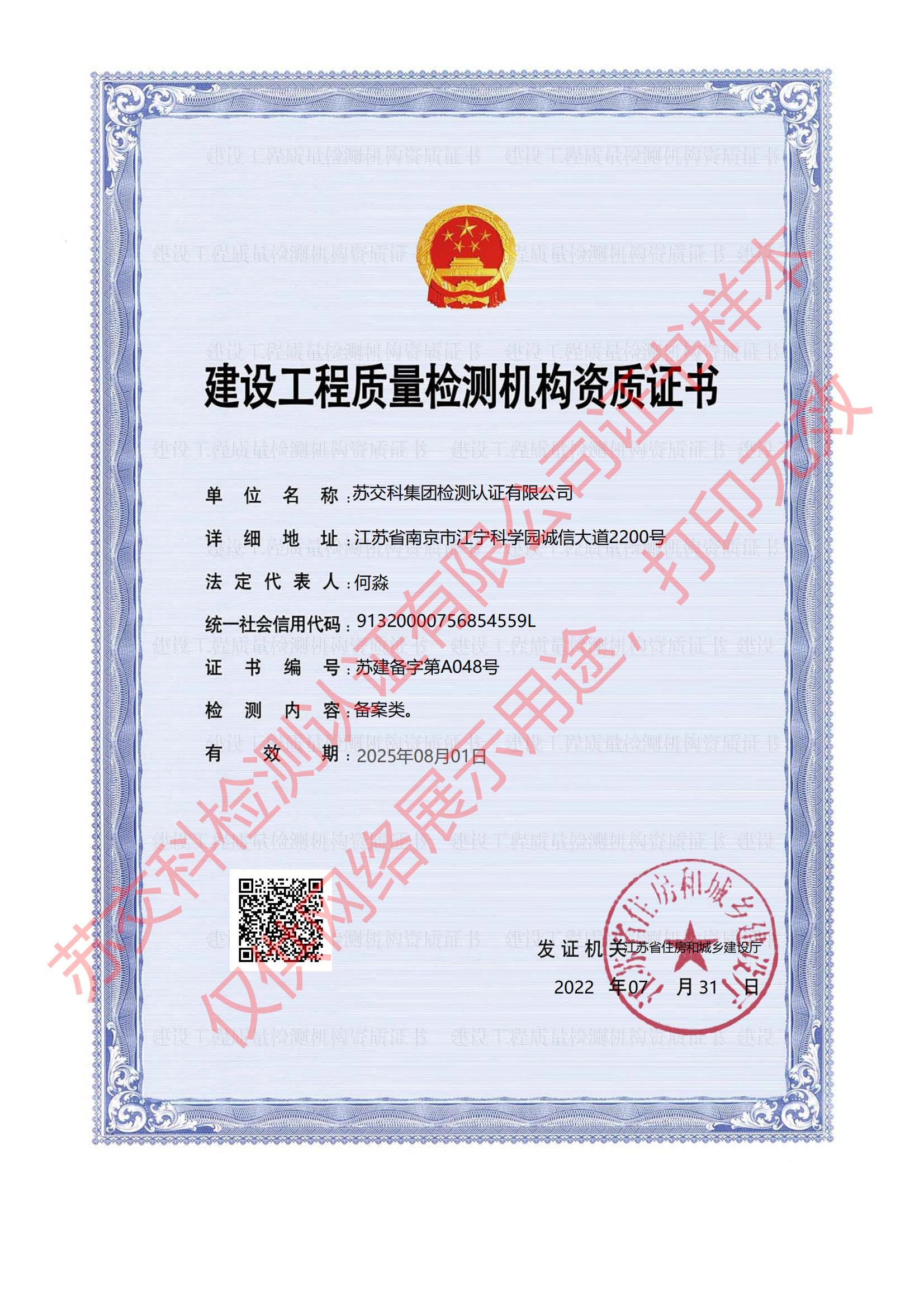 388vip太阳集团官网检测认证建设工程质量检测机构资质证书(备案类)