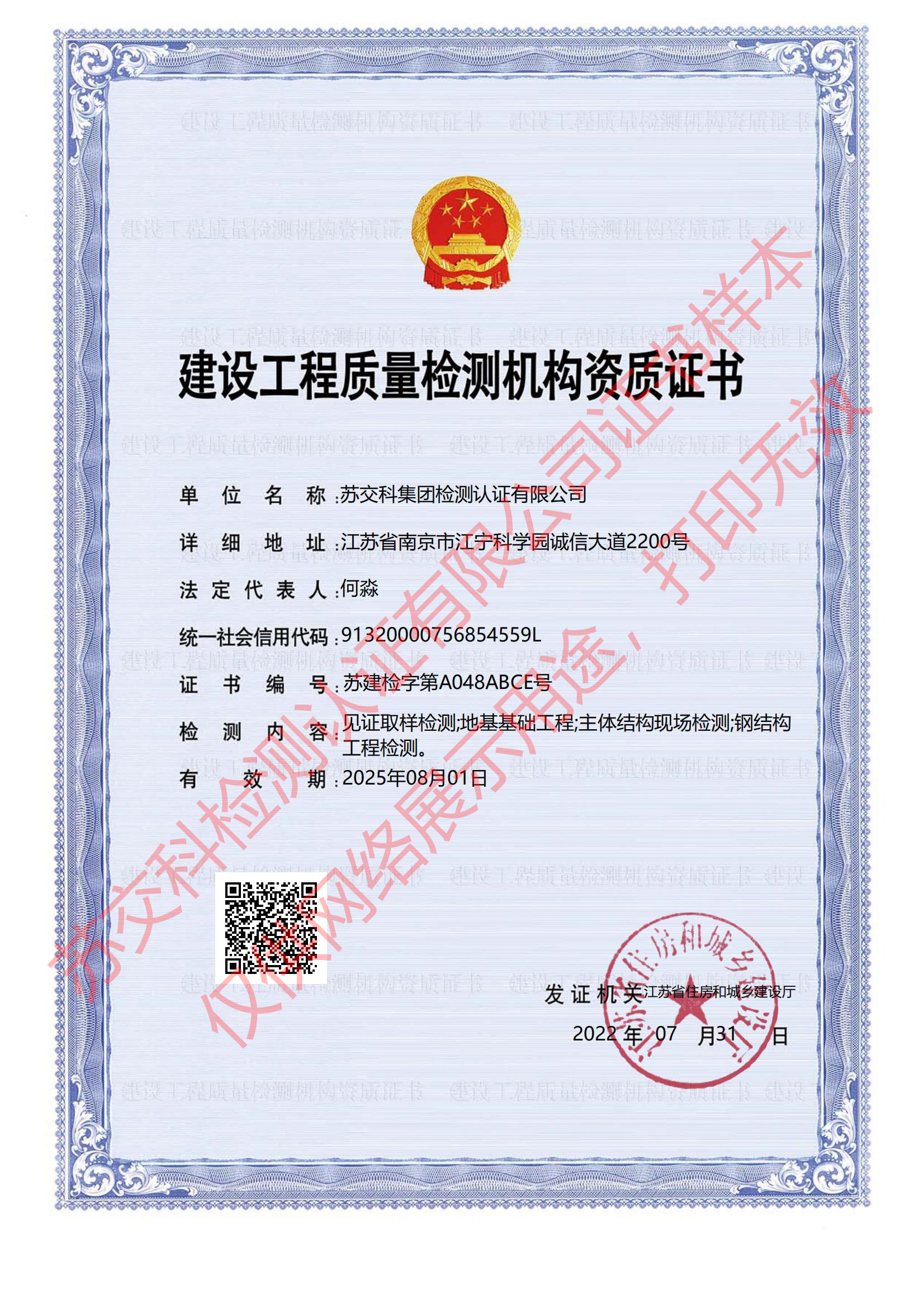 388vip太阳集团官网检测认证建设工程质量检测机构资质证书(检测类)