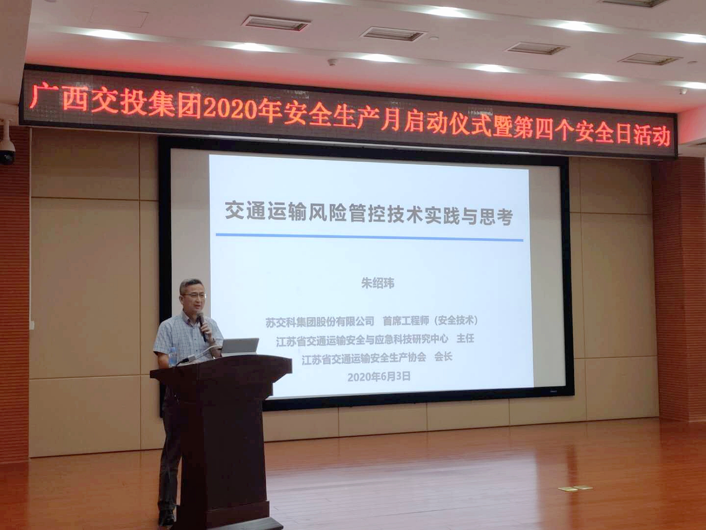 6月3日,广西交投集团举行2020年安全生产月启动仪式暨第四个安全日活动,公司党委书记、董事长周文,总经理王劼耘等出席。为强化员工安全意识,助力安全文化建设,集团首席工程师朱绍玮应邀出席本次活动并作《交通运输风险管控技术实践与思考》主题演讲。 ▲首席工程师朱绍玮应邀作主题演讲 朱绍玮对国家风险防控、安全生产相关政策进行专业解读,...