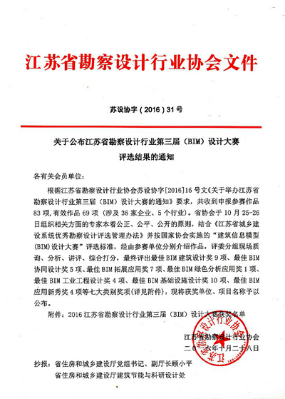 【喜讯】388vip太阳集团官网两项目获江苏省勘察设计行业第三届(BIM)设计大赛最佳BIM基础设施设计奖