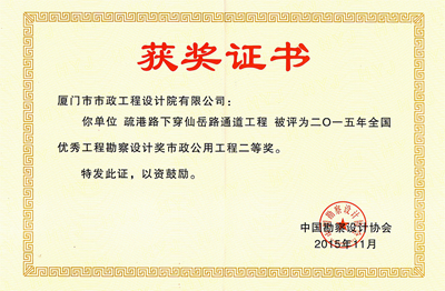 388vip太阳集团官网厦门市“疏港路下穿仙岳路通道工程”项目荣获2015年度全国优秀工程勘察设计行业二等奖