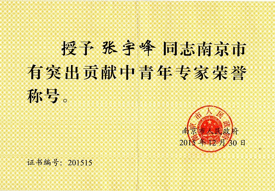 我公司张宇峰副总工荣获南京市有突出贡献中青年专家称号