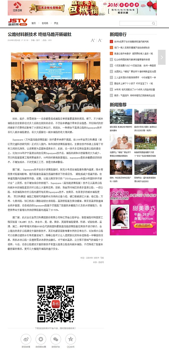 【媒体报道】公路材料新技术 终结马路开肠破肚——JSTV荔枝网于2016年3月4日民生版刊出