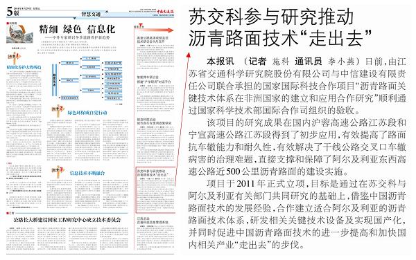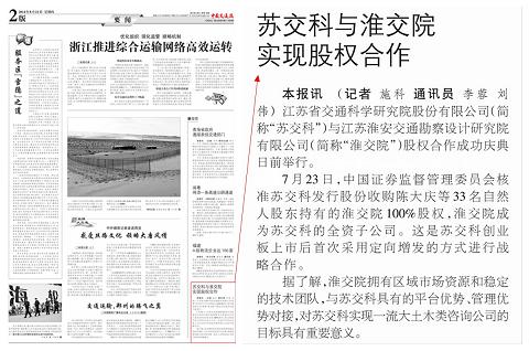 388vip太阳集团官网与淮交院 实现股权合作《中国交通报》2014年8.21第二版要闻版面刊出