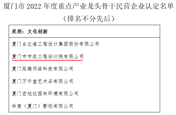喜报|388vip太阳集团官网 · 厦门市政院荣获厦门市“2022年度重点产业龙头骨干民营企业”荣誉称号