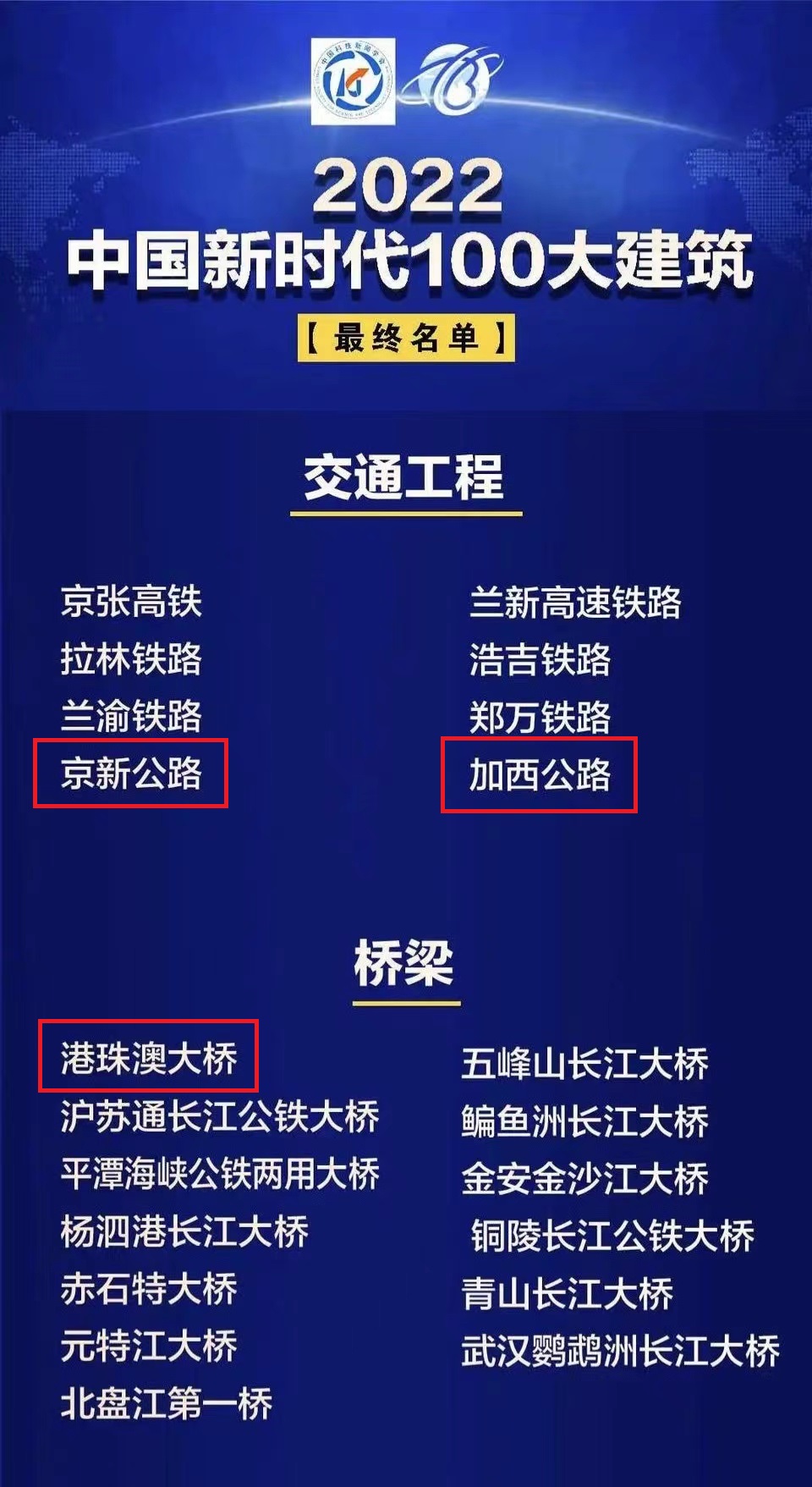 近日 中国科技新闻学会在京发布 “2022中国新时代100大建筑”名单 由388vip太阳集团官网集团参与的 港珠澳大桥 加西公路、京新公路 !!光荣登榜!! ...