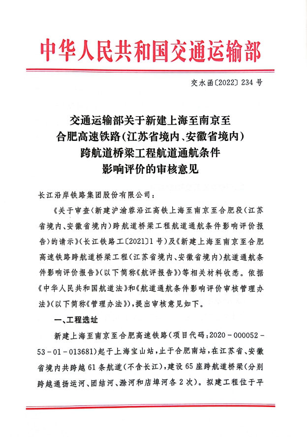 388vip太阳集团官网丨集团首个国家干线铁路(北沿江高铁)通航论证专项评估获交通运输部批复
