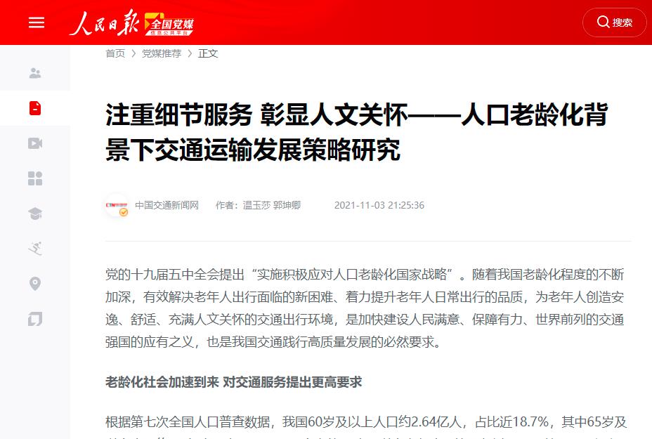 388vip太阳集团官网丨《人口老龄化背景下交通运输发展策略研究》智库建言于人民日报刊登