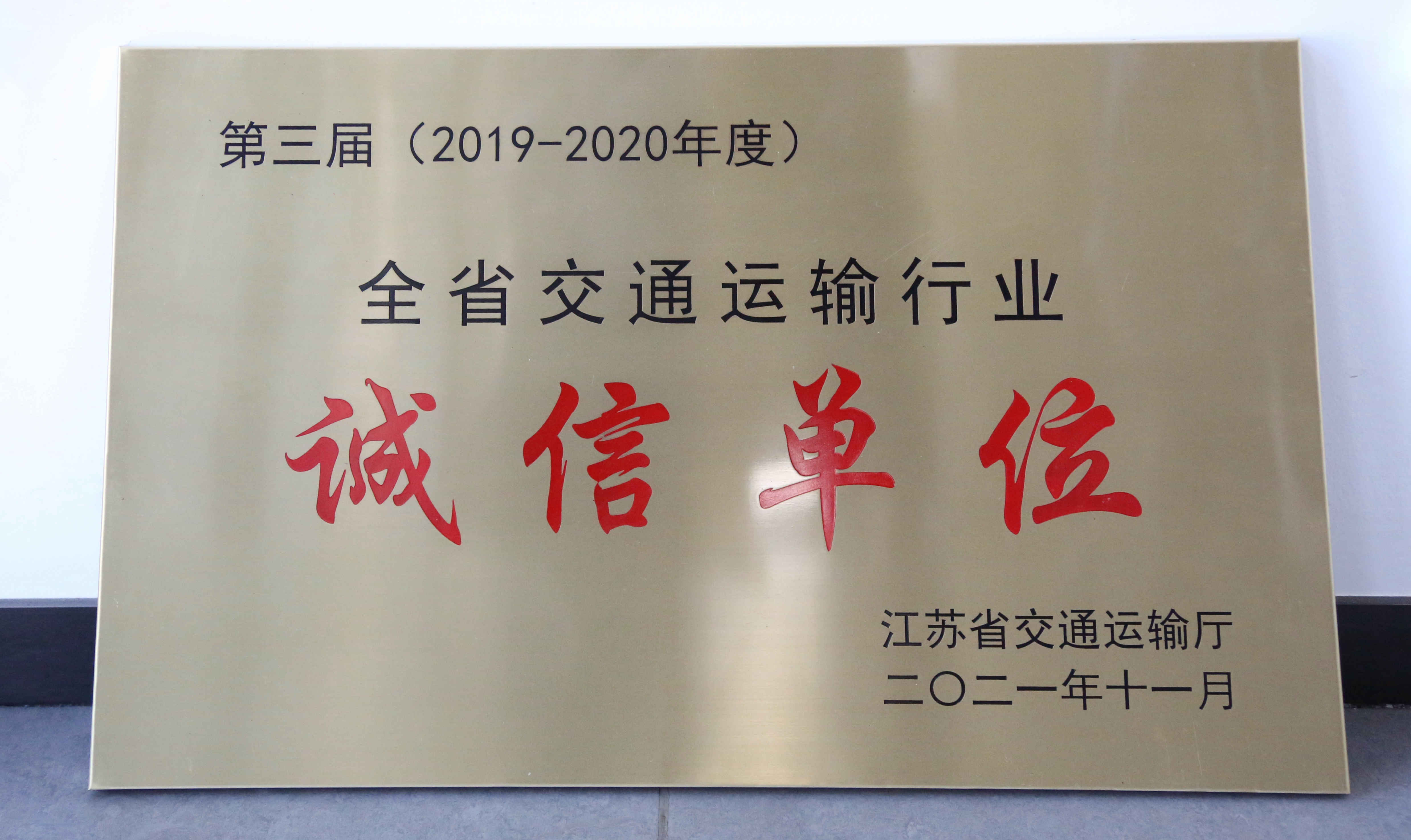 388vip太阳集团官网丨荣获第三届(2019-2020年度)江苏省交通运输行业“诚信单位”称号