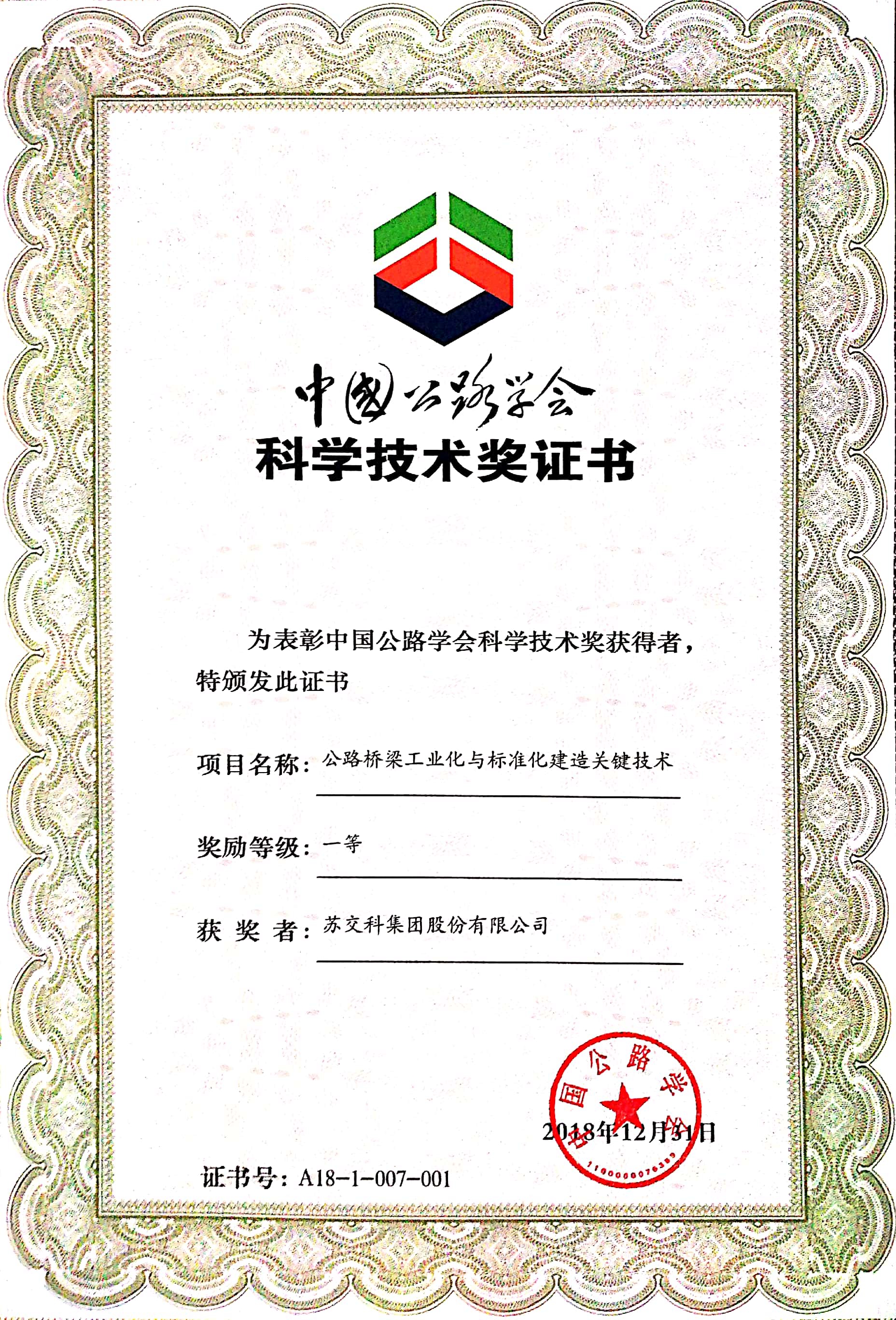 ▲“公路桥梁工业化与标准化建造关键技术”获奖证书