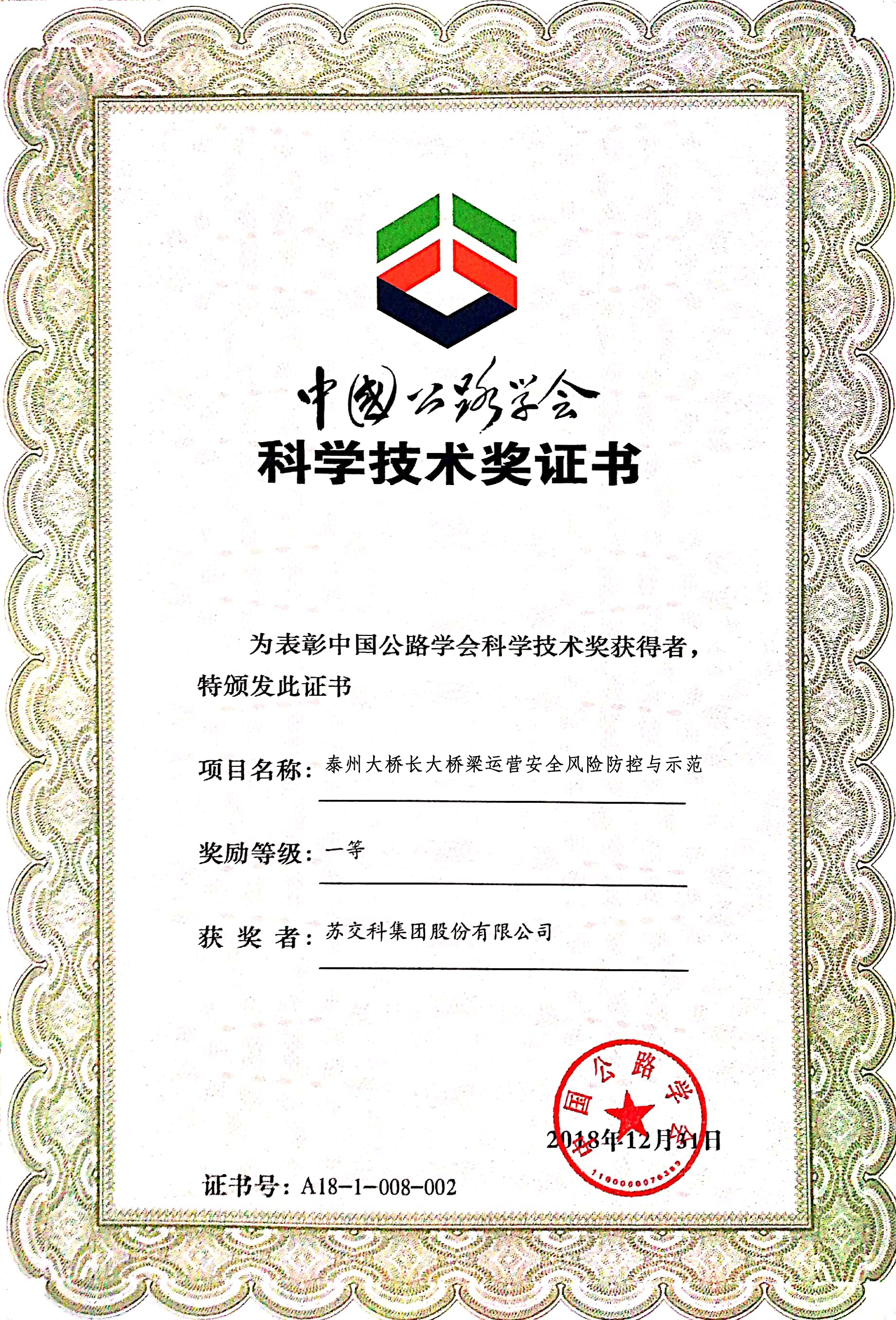 ▲ “泰州大桥长大桥梁运营安全风险防控与示范”获奖证书