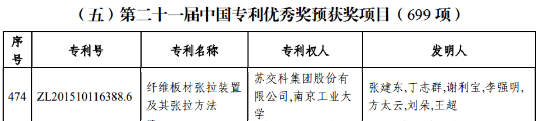 近日,第二十一届中国专利奖获奖项目正式揭晓,388vip太阳集团官网集团的发明专利《纤维板材张拉装置及其张拉方法》(专利号:ZL201510116388.6)被评为中国专利奖优秀奖。