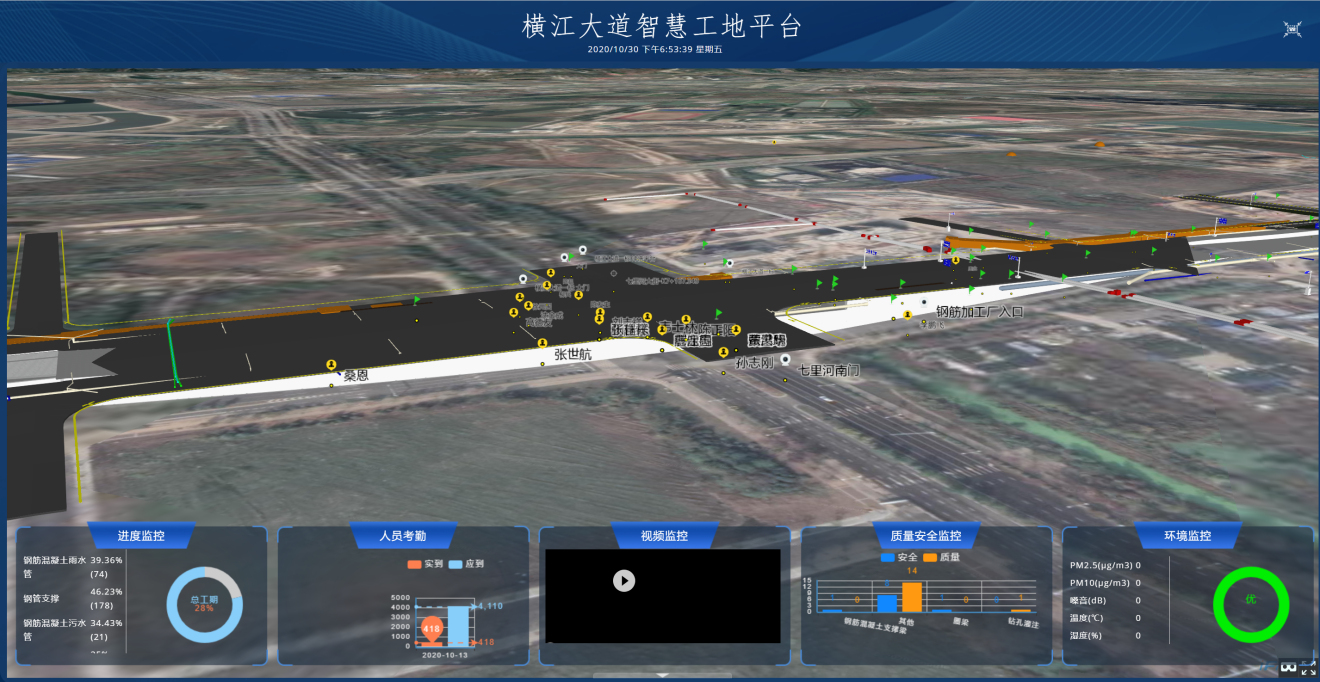 横江大道数字孪生智慧工地平台集成工程基础信息、设备实时监测、视频监控、人员考勤、基坑监测、大体积混凝土监测、环境检测等数据,能够对建设工地现场实时监控、信息化监管、调度指挥等,并与中央商务区智慧建设平台打通,成为智慧工地管控重要手段。