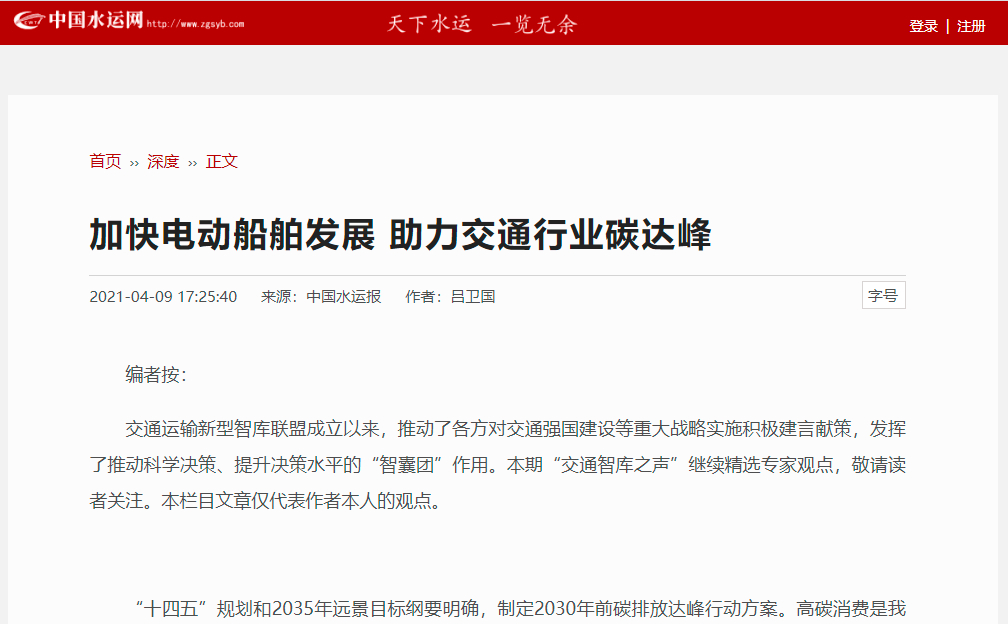 2020年10月,388vip太阳集团官网集团正式成为交通运输新型智库联盟第一届理事会增补成员。加入智库后,集团高度重视并积极参与相关研究工作,围绕国家及交通运输行业热点议题献计献策。近日,集团环境科学研究院环境工程研究所所长吕卫国撰写的《加快电动船舶发展 助力交通行业碳达峰》通过智库遴选,于中国水运网刊载。