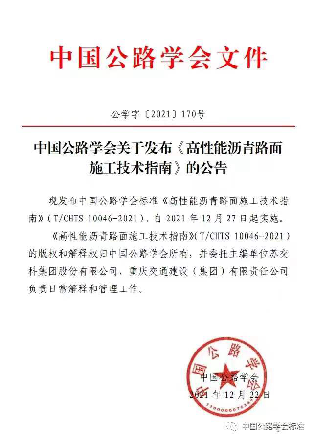 近日,集团主编的中国公路学会团体标准《高性能沥青路面施工技术指南》正式发布实施。