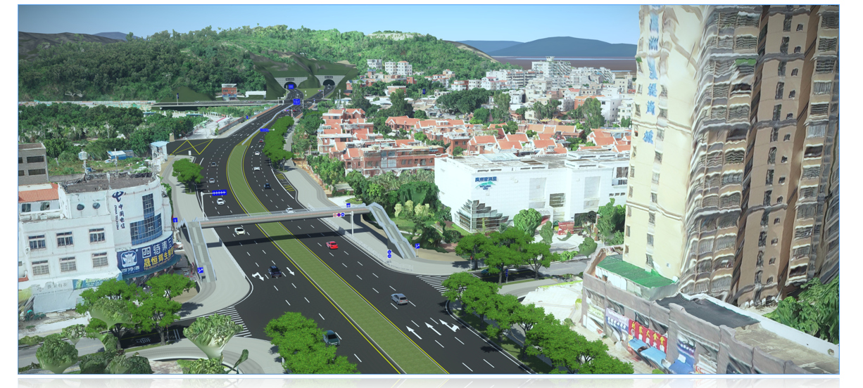 项目组充分运用BIM技术,利用Bentley系列BIM软件,建立全线道路、桥梁和隧道模型;结合无人机航拍技术,生成项目实景模型;BIM模型结合实景的方式,为设计人员快速、深入开展设计工作提供了有力支撑。此外,在行车视距分析、净空分析、交通模拟、景观模拟、碰撞检测、辅助项目征迁等等方面应用BIM技术进行性能分析,充分提高了设计质量和效率。