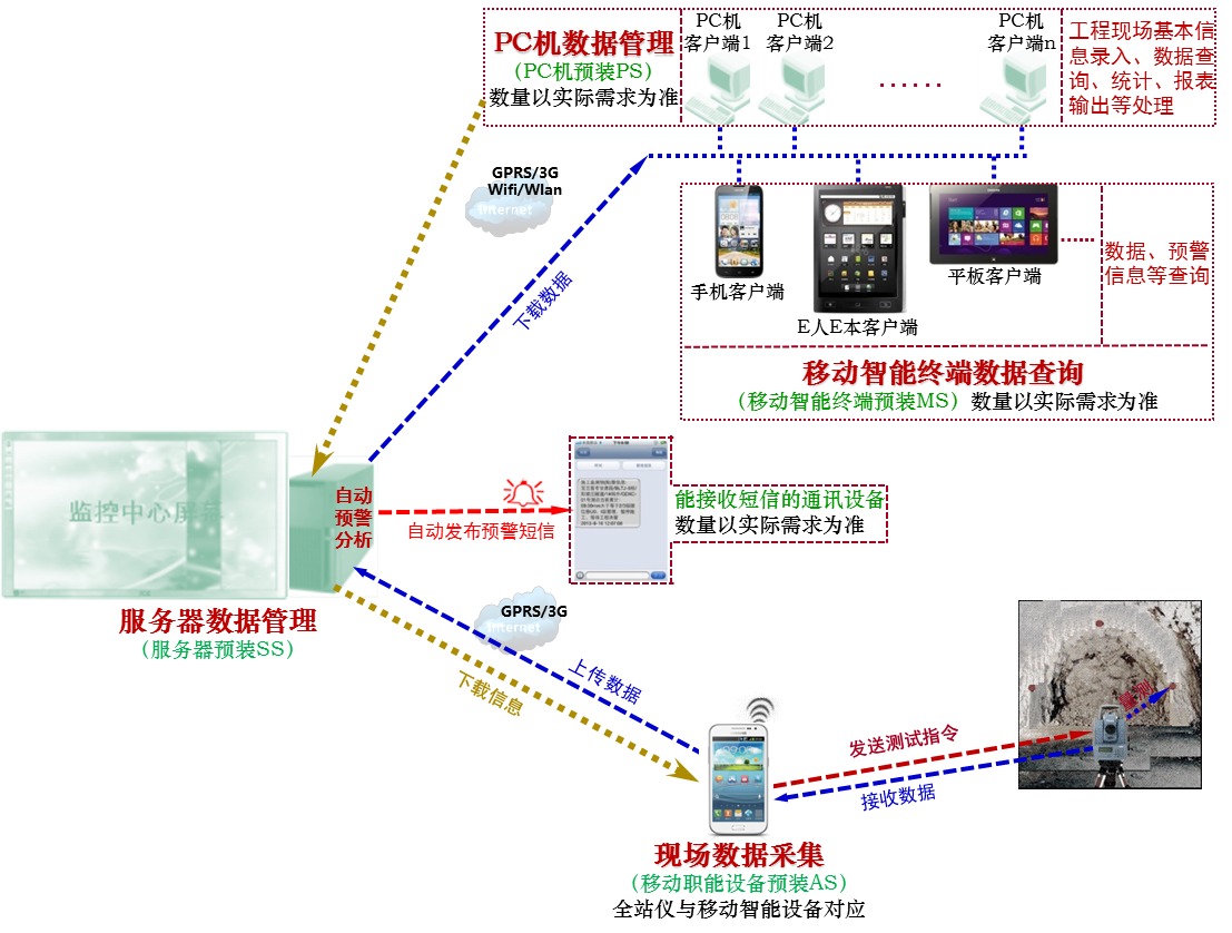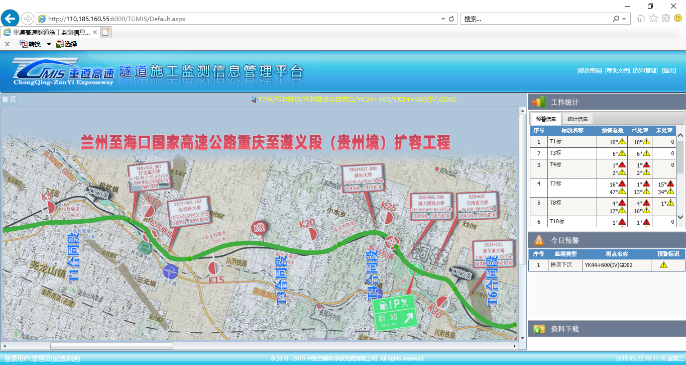 本项目引入了隧道施工监控量测信息系统,利用现代通讯手段使各管理层面人员具备“千里眼、顺风耳”的监管能力,为操作人员和各级管理人员建立信息共享的纽带和桥梁,补齐管理短板,强化安全意识。同时,打造集“现场数据采集、自动分析与处理、及时预警、远程监控、管理考核”于一体的隧道施工监测管理系统,并实现有效监管。