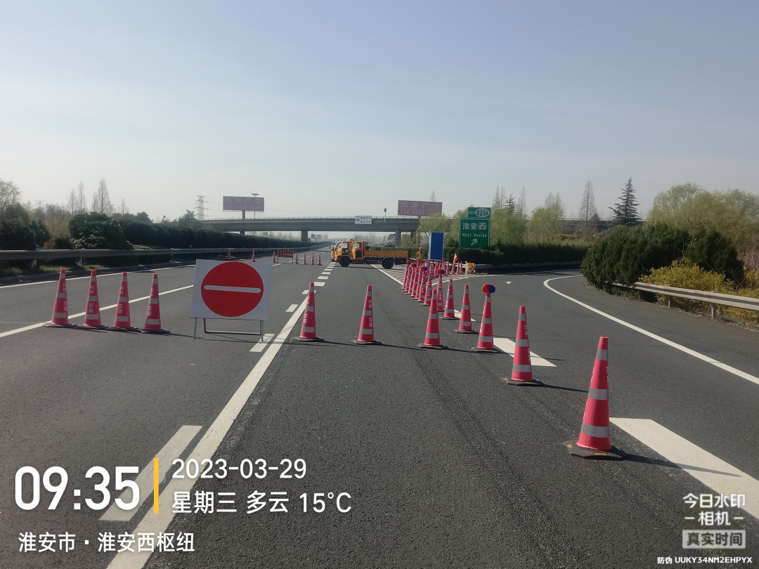 淮安大桥主梁采用整体式断面,荷载试验时需双向封闭桥梁所在的路段,而淮安大桥位于淮安南枢纽和淮安西枢纽之间,所在路段为G25长深高速和G1516盐洛高速的共线部分。现场交通管制难度大、交通组织复杂、联动沟通单位多、工作细节繁琐、试验准备工作要求高。
