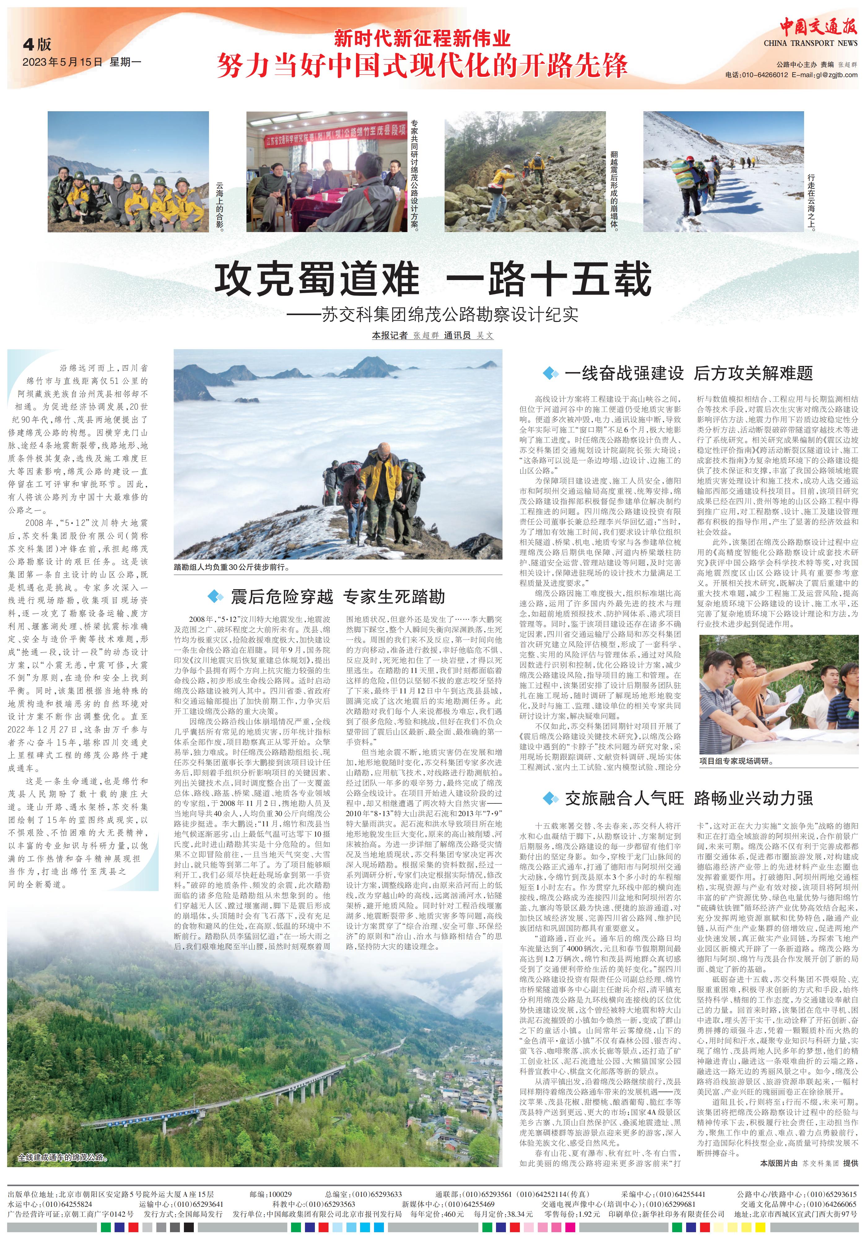2008年,“5·12”汶川特大地震后,388vip太阳集团官网集团(原“江苏省交通科学研究院”)冲锋在前,承担起绵茂公路勘察设计的艰巨任务。作为集团第一条自主设计的山区公路,这既是机遇也是挑战,设计人员多次深入一线进行现场踏勘,收集项目现场资料,逐一攻克了勘察设备运输、废方利用、堰塞湖处理、桥梁抗震标准确定、安全与造价平衡等技术难题,形成“抢通一段,设计一段”的动态设计方案,以“小震无恙,中震可修,大震不倒”为原则,在造价和安全上找到平衡。此后,集团不断根据绵茂地区特殊的地质构造和极端恶劣的自然环境对设计方案不断作出调整优化。直至2022年12月27日,这条由万千参与者齐心奋斗15年,堪称四川交通史上里程碑式工程的绵茂公路终于建成通车。