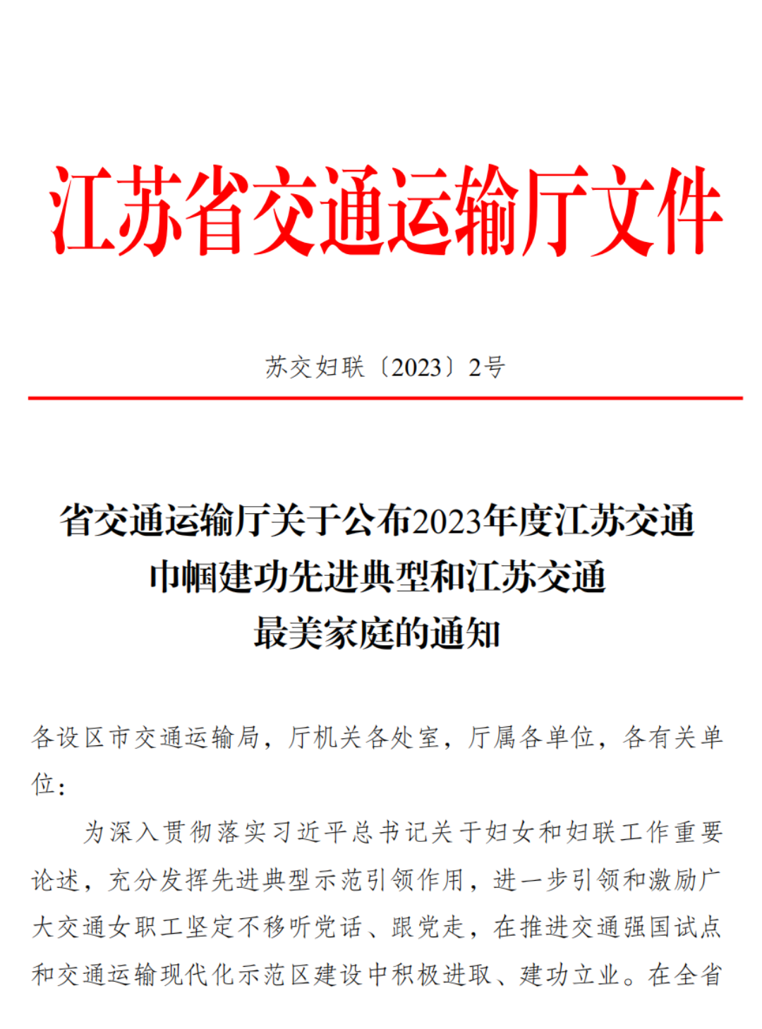 近日,江苏省交通运输厅发布“2023年度江苏交通巾帼建功先进典型和江苏交通最美家庭”的获奖名单,
