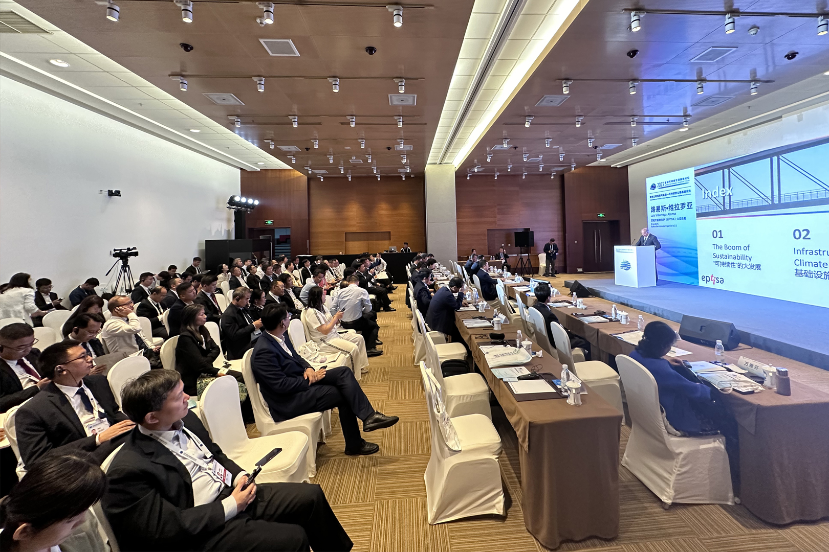 Luis Villarroya董事长发表《可持续交通设施发展趋势》主题演讲,深度聚焦全球温升控制目标,围绕可持续发展的繁荣、基础设施与气候变化以及未来预测三大方向,从环境、社会、经济、政策管理等各方面展开探讨,引起与会领导嘉宾的热烈反响。
