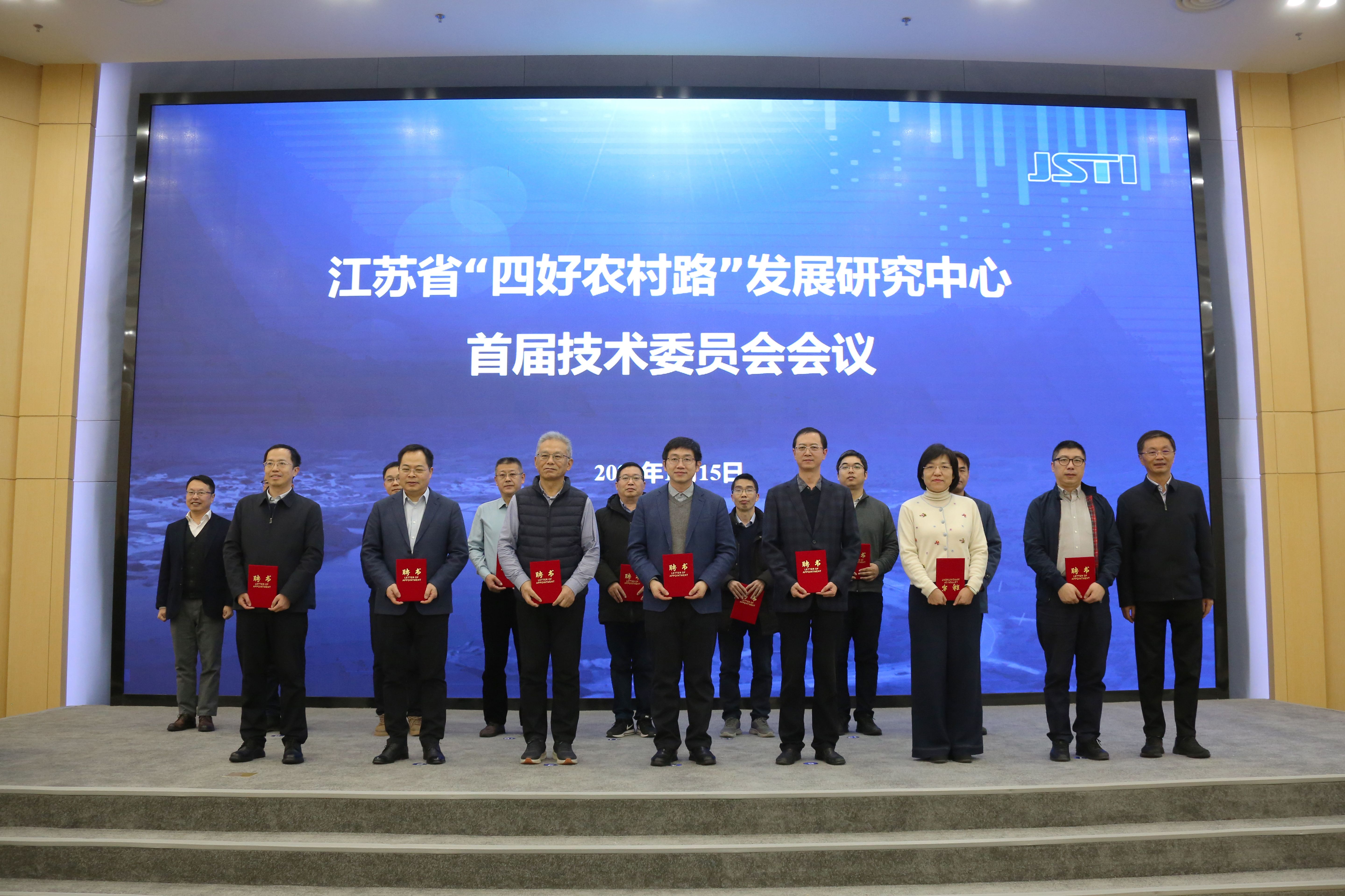 胡萌主任宣读研究中心技术委员会组成名单。江苏省交通运输厅党组成员、副厅长丁峰和集团总裁朱晓宁,共同为研究中心技术委员会成员代表颁发聘书。
