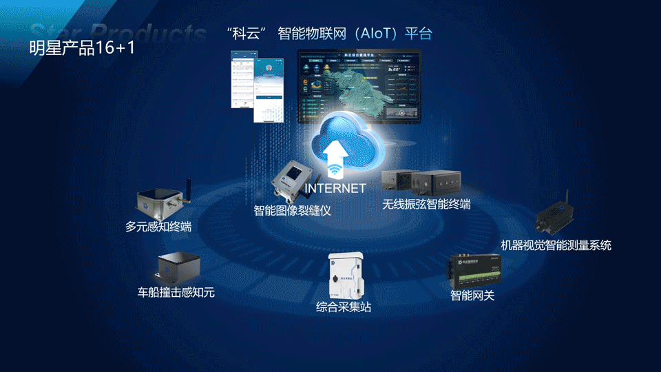 围绕“传感-终端-平台”产业化发展路径,集团打造了16款轻量化监测装备、1套智能物联网平台—— “科云AIOT”。实现了设备接入管理、数据处理与分析、监测场景应用开发等功能,赋能各类基础设施运营安全监测数智化场景。