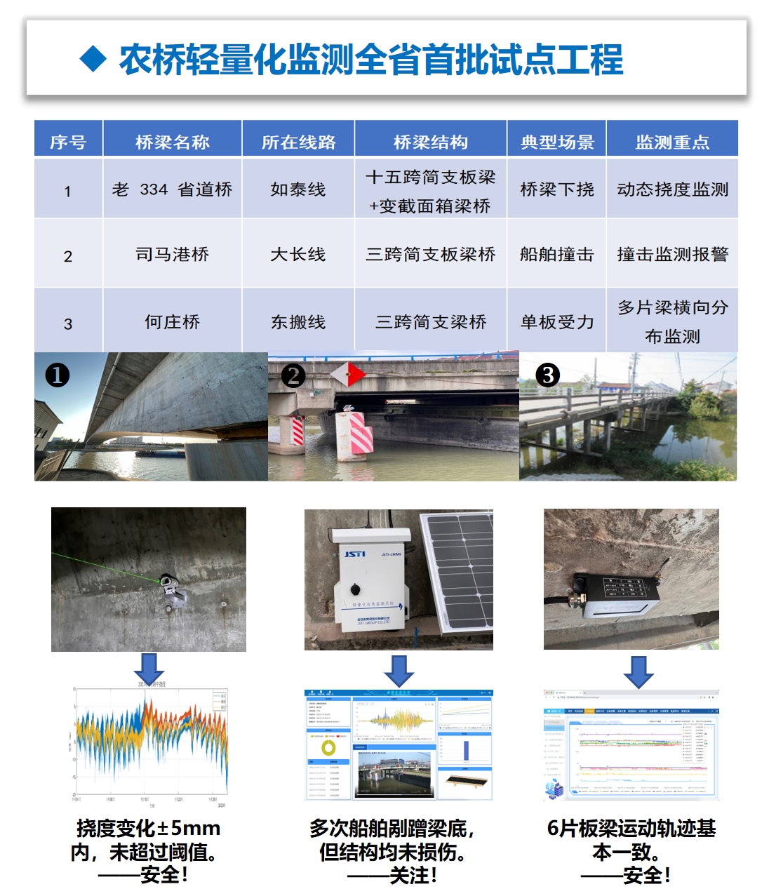 目前,集团针对桥梁轻量化监测场景打造了16款自研产品和1套智能物联网平台,现已在江苏省国省干线公路桥梁、城市生命线桥梁等百余座桥梁成功应用。此外,这一新兴产业的蓬勃发展不仅为桥梁安全保驾护航,还强有力地推动了传感器技术、通信技术、加工制造业等传统领域的转型升级,促进了产业链上下游的协同创新,塑造了全新的生产力形态,为行业进步注入强劲动力。