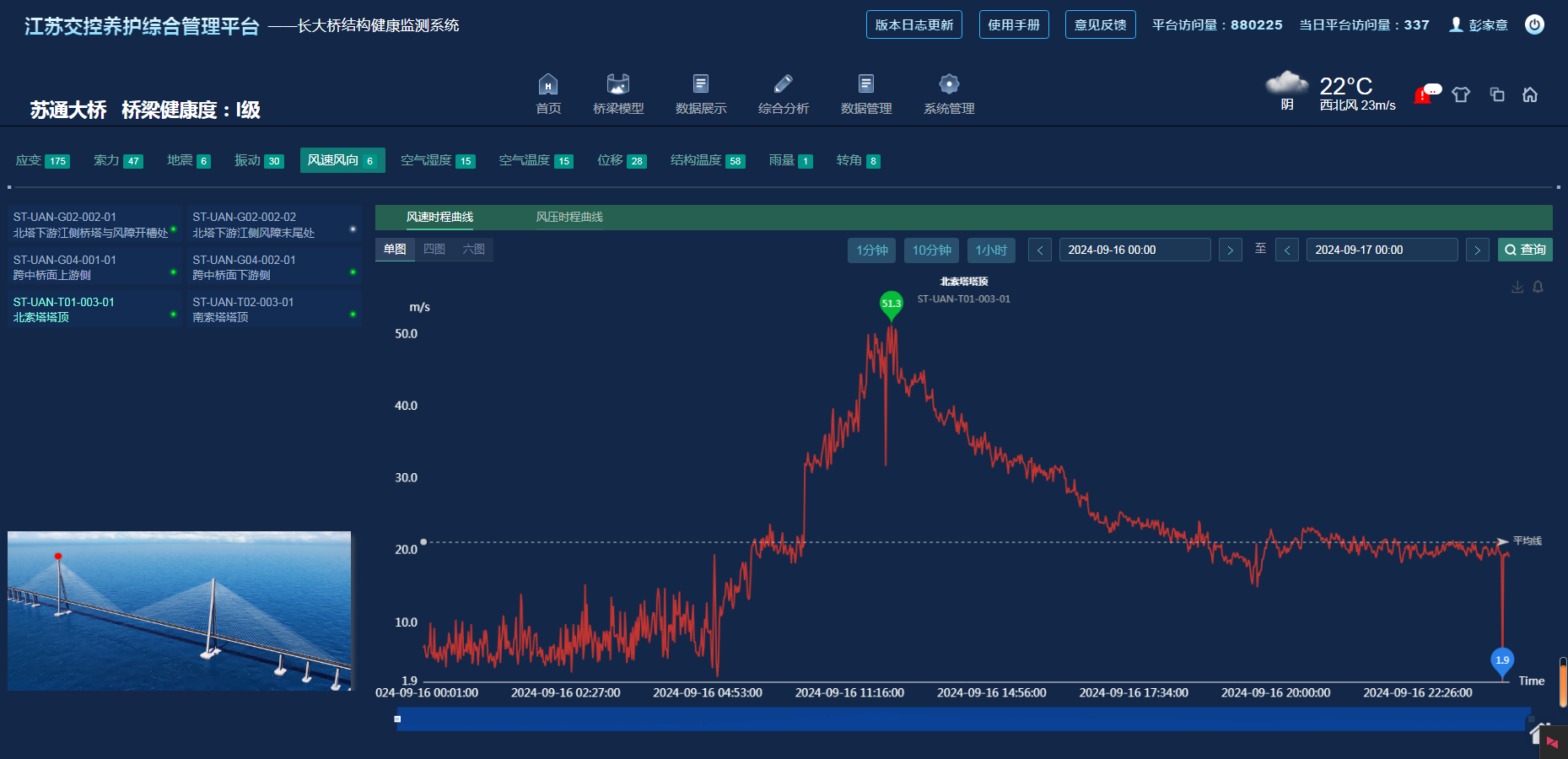 台风期间,正值中秋假期,388vip太阳集团官网集团桥梁监测人员通过开发的桥群监测系统24小时应急值守,保障各大桥监测系统稳定运行,保障系统报警及时上报。同时,采用监测平台自动报警及移动端定时通报相结合的方式,保障管养单位及时准确了解长大桥梁所处风场情况,辅助现场养护管理决策。