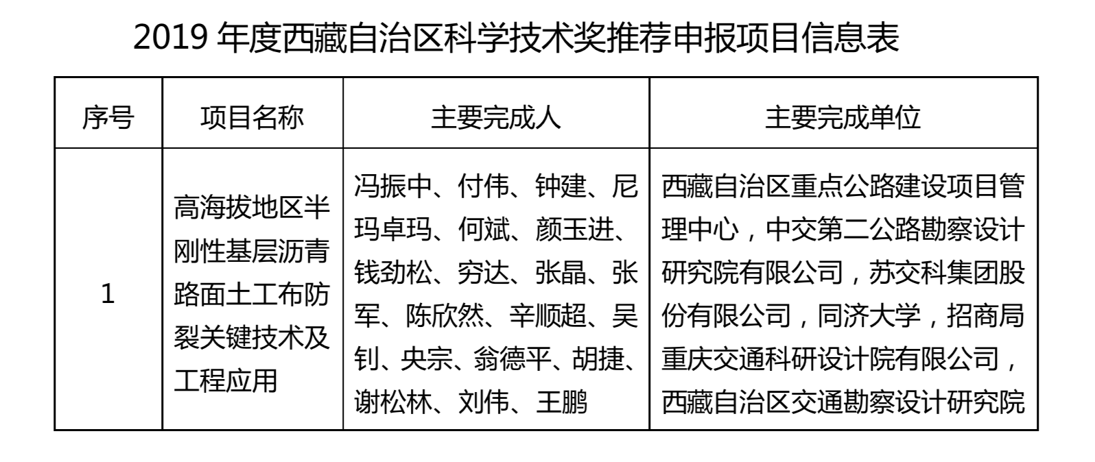 根据《关于2019年度西藏自治区科学技术奖推荐工作的通知》(藏科发[2019]2号)要求,经我公司认真研究,决定推荐《高海拔地区半刚性基层沥青路面土工布防裂关键技术及工程应用》项目申报2019年西藏自治区科学技术奖。现对2019年度申报“西藏自治区科学技术奖”项目予以公示。